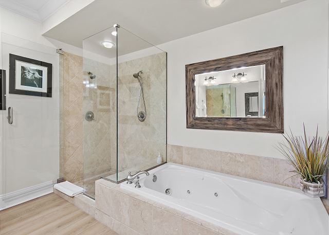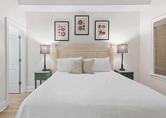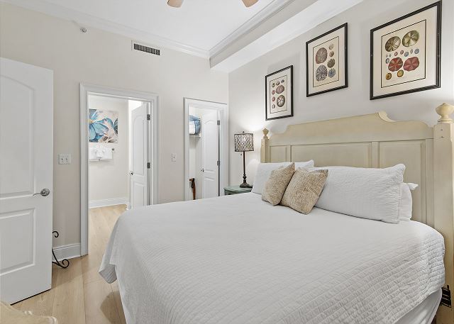 Primary Suite: King bed, private bath with walk-in shower, soaking tub, double sinks, and a desk for remote work. Large walk-in closet (fits the provided Pack ’n Play).