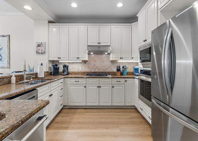 The kitchen is fully equipped for family meals—from quick breakfasts to seafood feasts—with a Keurig and drip coffee maker, blender, crockpot, shrimp pot, microwave, stainless refrigerator/freezer, and a stand-alone ice maker. Step right outside your door to the community gas grills (grilling tools provided).